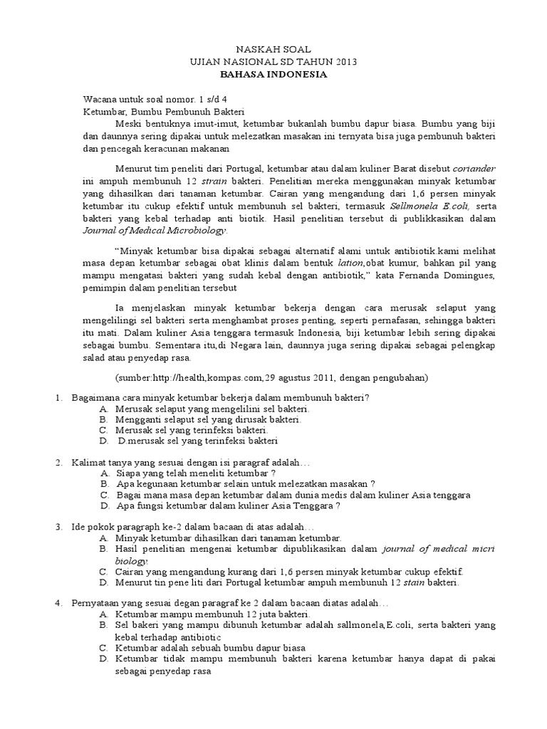 Tempe merupakan makanan tradisional indonesia berbahan dasar kedelai yang difermentasi. Berikut ini, terdapat salah satu contoh soal ujian nasional sd yang bisa digunakan sebagai latihan dirumah. Pemulihan ekonomi indonesia yang berjalan lamban, menurut minasapti triaswati, dosen fakultas psikologi universitas indonesia, tidak. 07.30 09.20 (120 bacalah teks berikut untuk menjawab soal no 1 5 film jadi media baru seni pertunjukan indonesia film merupakan media baru bagi seniman tari. Disini kami akan membagikan kumpulan soal ujian nasional (un) mi yang terdiri mata pelajaran matematika, ipa (sains), dan bahasa indonesia mulai dari tahun 2011 sampai tahun 2016.